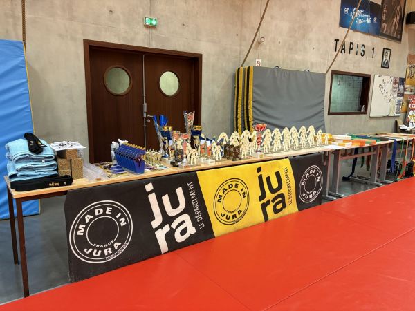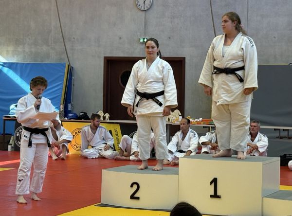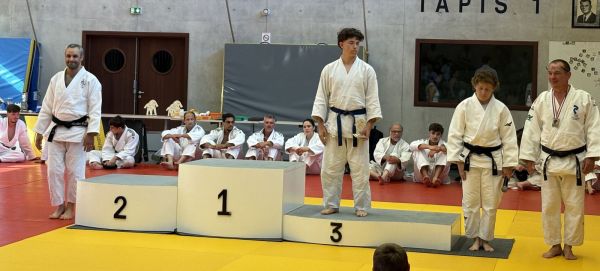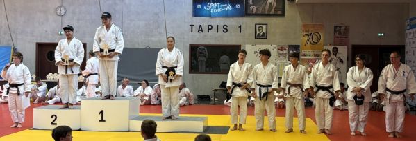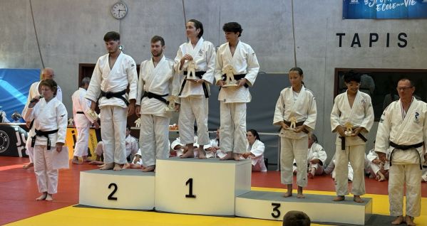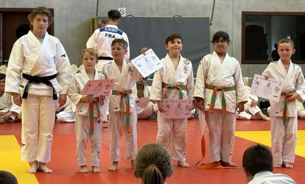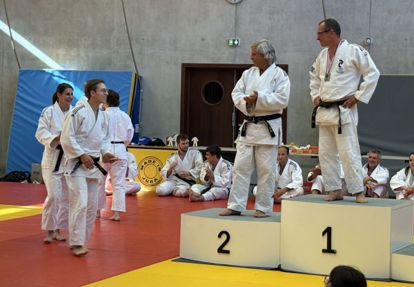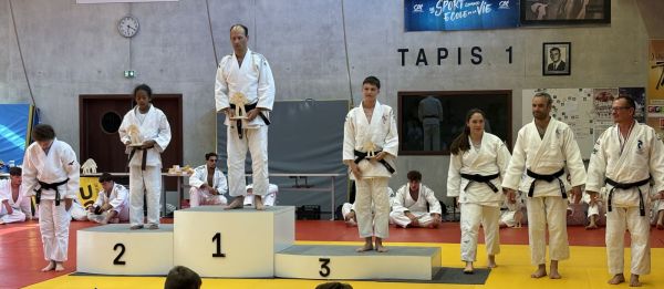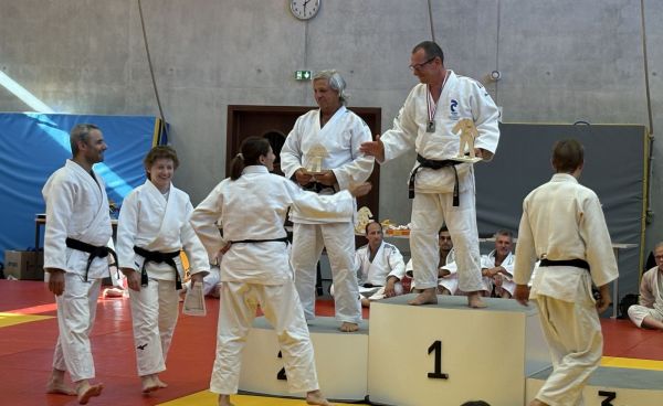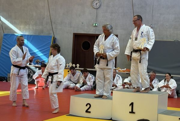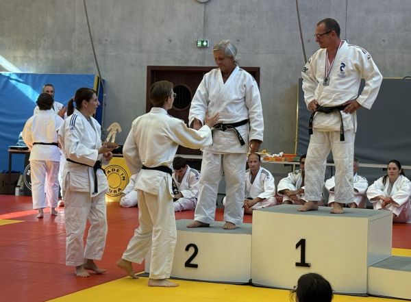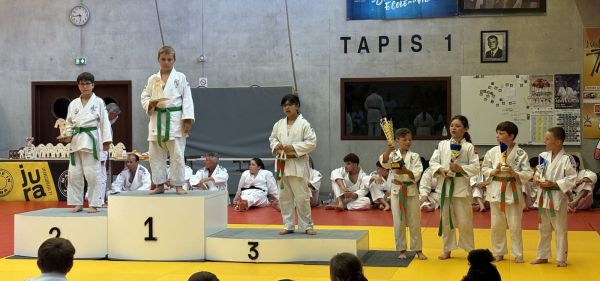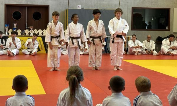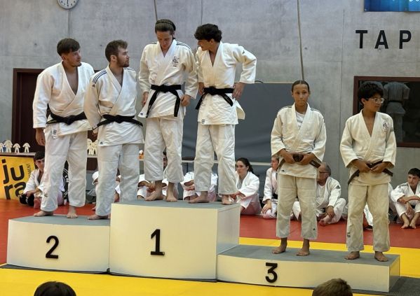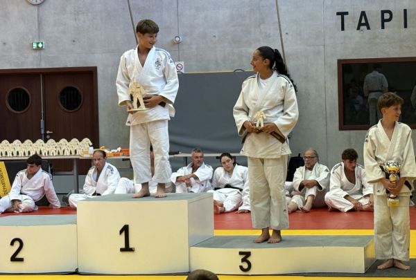 Kata : 1er GILLE Antoine et DOLLFUS-DONATI Soren, 2ème DEBOT Aymeric et ESTEVES Josselin , 3ème CRETIN Eline et LARHZAL Louay récompensés avec un trophée